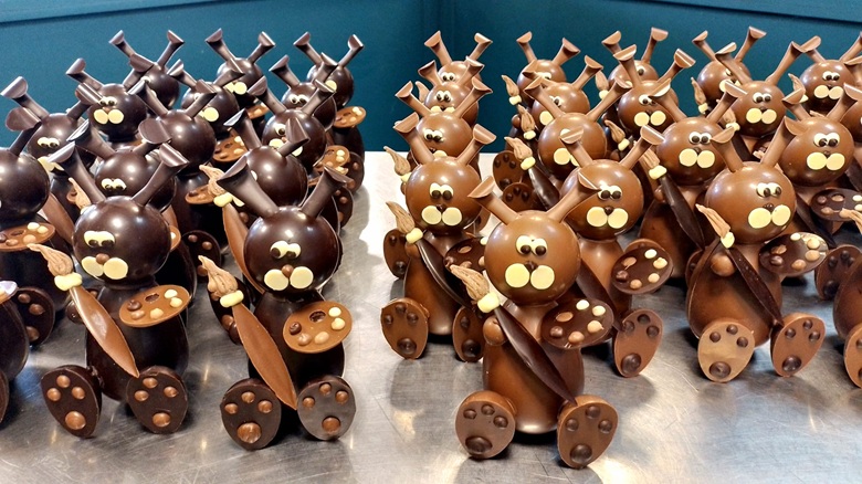 un moulage gourmand en chocolat noir ou lait, garni de fritures de Pâques croquantes,